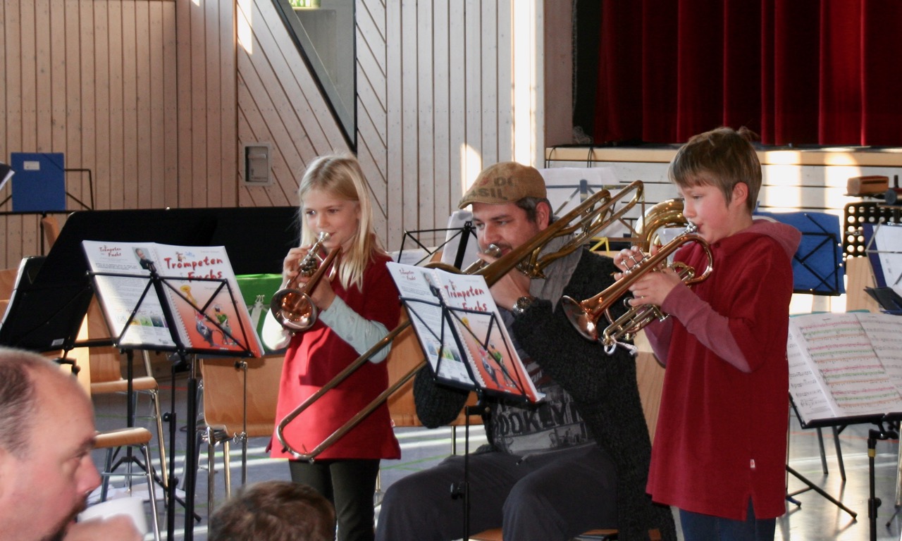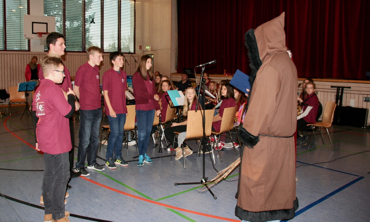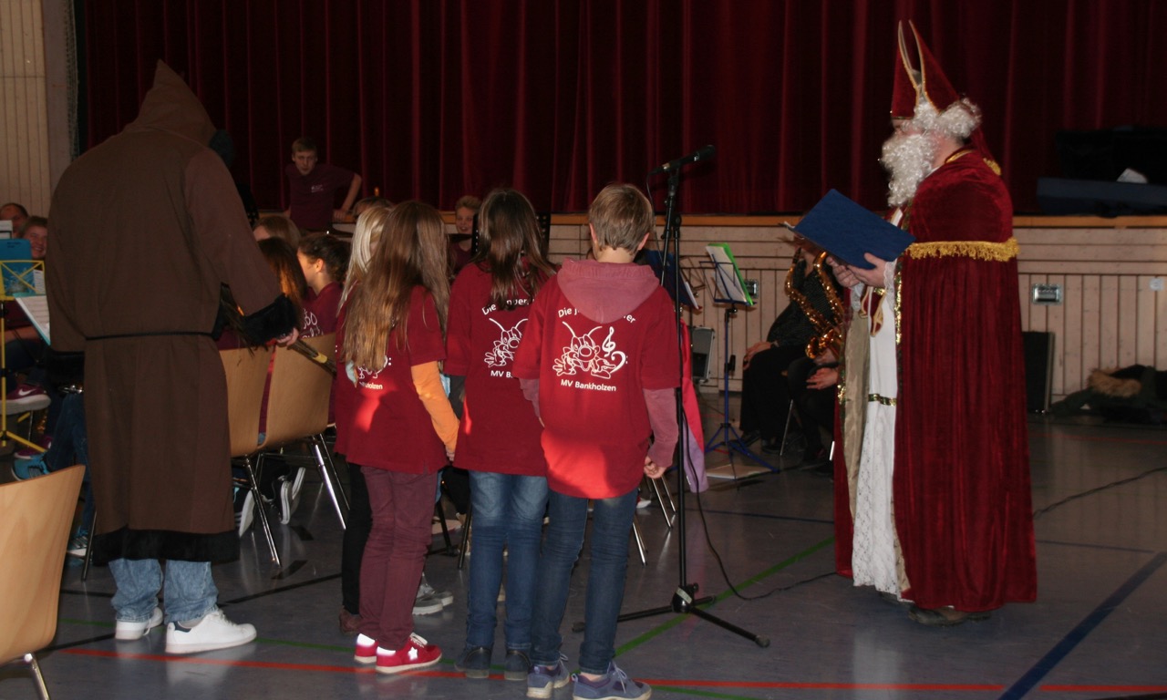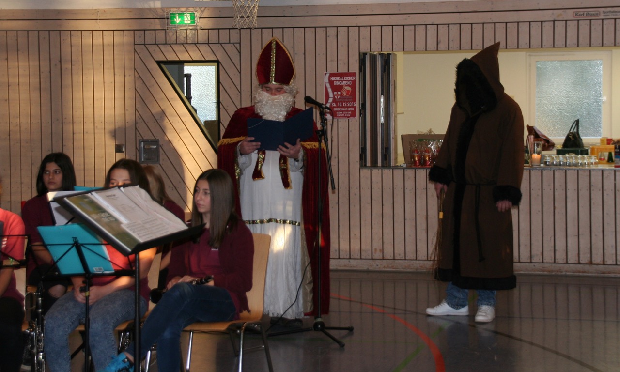 Im Anschluss nahm das JB²O auf der Bühne Platz. Nach dem ersten Stück wurden die Ehrungen für das Bronzene und Silberne Abzeichen durch die Jugendleiter Johannes und Tobias vorgenommen. Danach spielten die Jungen Hüpfer und das JB²O gemeinsam Weihnachtslieder. Natürlich besuchte uns auch noch der Nikolaus mit seinem Knecht Ruprecht, welcher kleine Geschenke an die Kinder und Jugendlichen verteilte.
