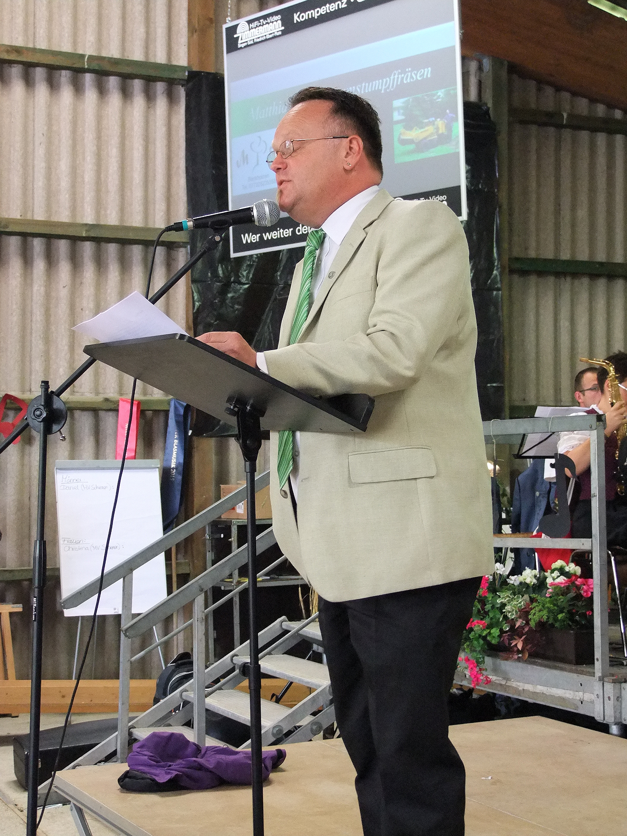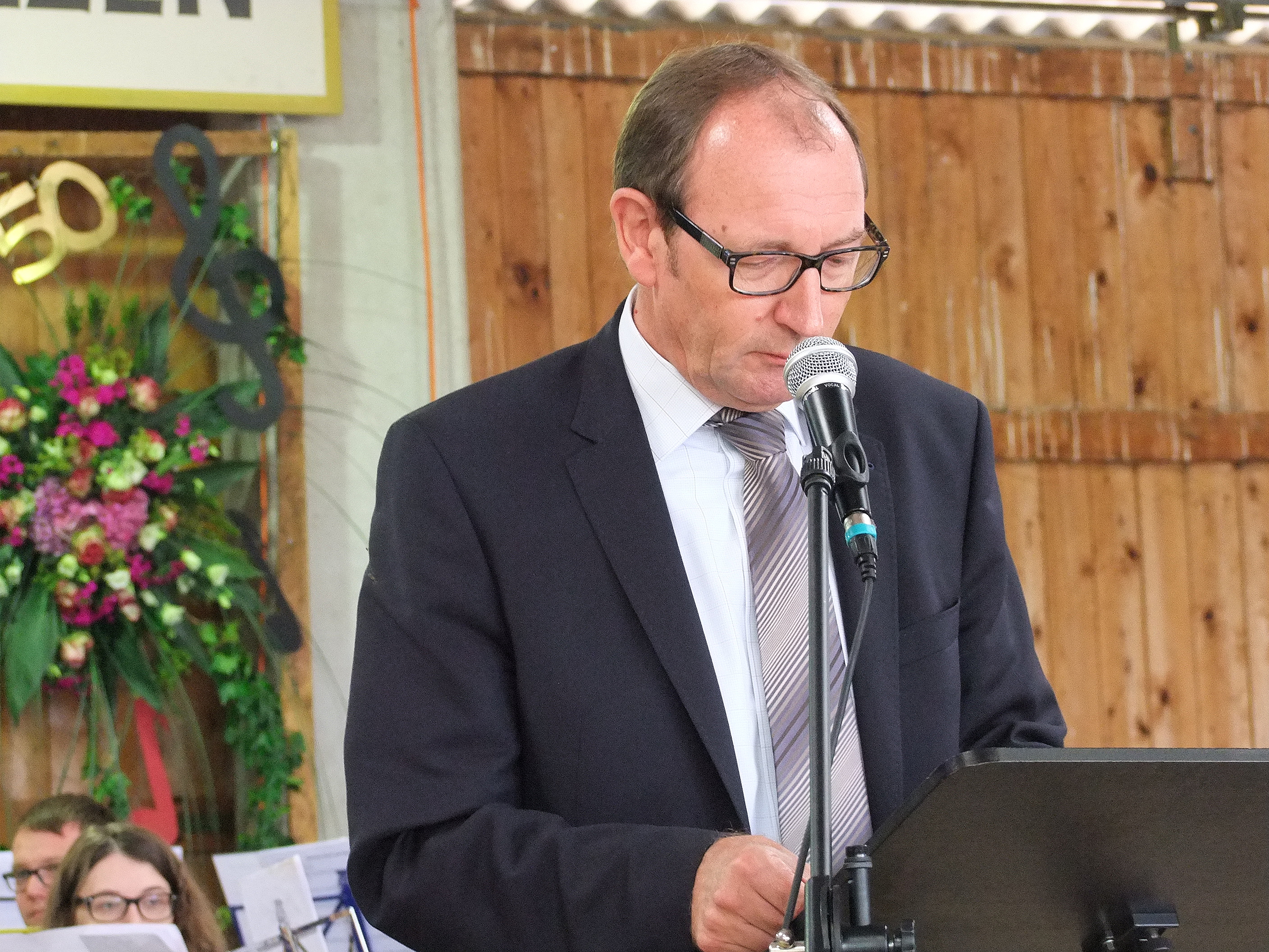 Der Vorsitzende des Blasmusikverband Hegau Bodensee, Johannes Steppacher nahm zwischen den Stücken noch einige Ehrungen an den Vereinen vor. Ebenfalls gab es ein Grußwort unseres Bürgermeisters Peter Kessler, welcher uns zu Ehren unseres Jubiläums eine kleine Spende überreichte.